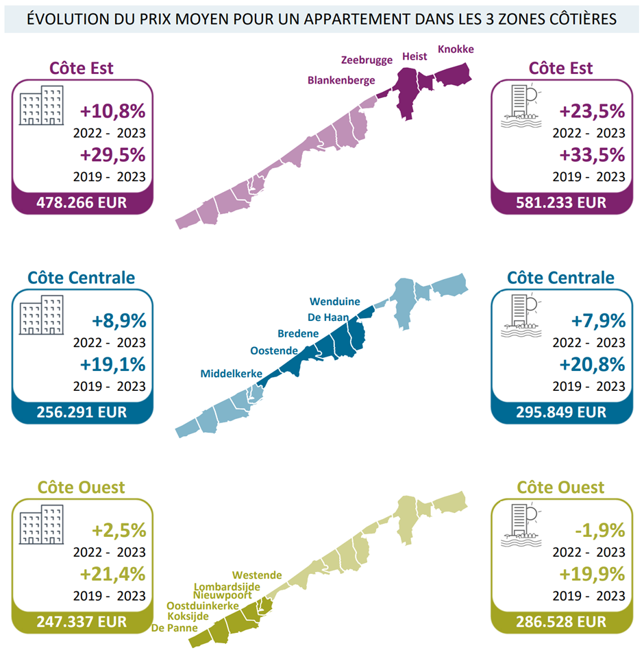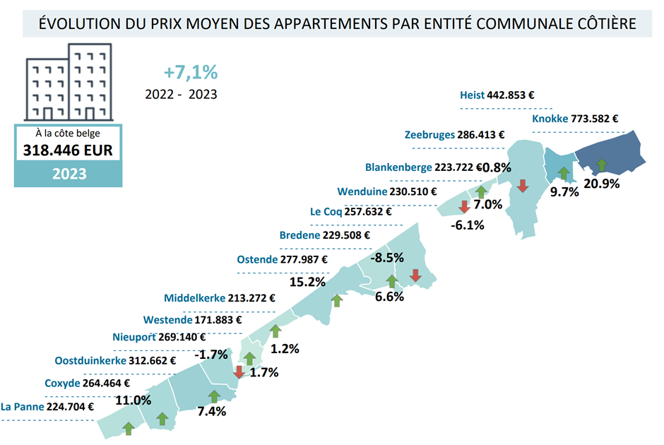 Le prix moyen d’un appartement à la côte est de 318.446 euros en 2023. Le niveau de prix des appartements à la côte est supérieur de +20,3 % à celui des appartements en Belgique, +15,2% par rapport à la Flandre et +7,3% par rapport à la moyenne en Flandre Occidentale.