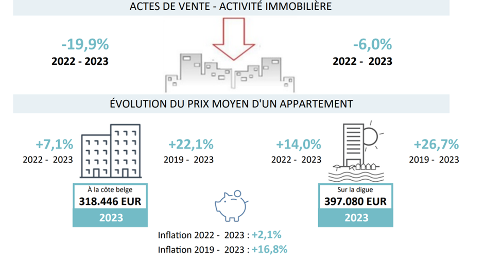 L’activité immobilière à la côte a subi un ralentissement en 2023 avec une diminution des actes de vente de -19,9%, un chiffre à mettre en parallèle avec la diminution des actes de vente en Flandre en 2023 : – 16,9% (-15,2% au niveau national). L’activité immobilière (en résumé tous les biens immobiliers qui ont changé de main suite à une vente mais également une donation, une succession,…) est aussi à la baisse à la côte : -6%