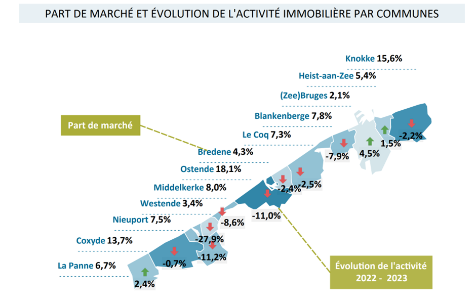 En 2023, l’activité immobilière côtière représente 7% de l’ensemble des transactions immobilières en Flandre et 4,2% de l’ensemble des transactions immobilières en Belgique. Cette dernière est restée stable sur ces 5 dernières années. Plus d’un tiers de l’activité immobilière en Flandre occidentale se situe dans les communes côtières (33,2%). La commune d’Ostende conserve un peu moins d’ 1/5 de part de marché de la zone côtière (18,1%). Les communes de Knokke, Ostende et Coxyde occupent presque la moitié de la part de marché de la côte belge (47,4%).
