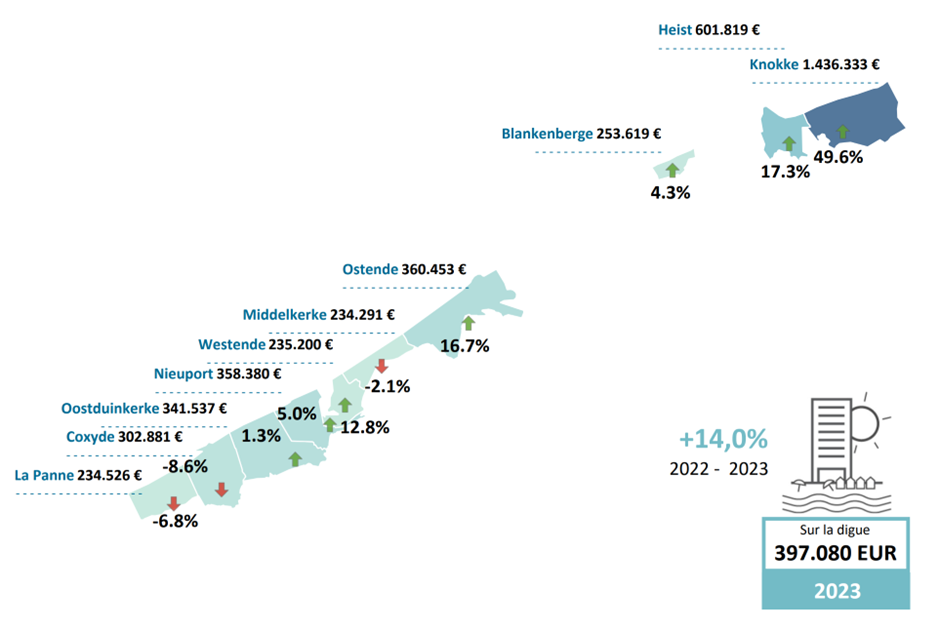 Le prix moyen d’un appartement sur la digue est bien sûr toujours plus élevé qu’un appartement dans les entités communales (397.080€), soit une différence de prix de +24,7% (+78.623€). L’évolution du prix moyen par rapport à 2022 est de +14% (+48.884€). Comme pour les appartements dans les entités communales, cette forte augmentation compense la baisse de -5,2% enregistrée l’année dernière.