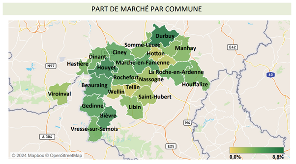 En 2023, des 24 communes répertoriées dans baromètre, Durbuy a enregistré la plus grosse part de marché (8,8%), devant Houyet (7,6%) et Bièvre (6,7%). A l’inverse, Tellin (1,4%), Hotton (1,5%) et Rendeux (1,7%) ont connu une activité moindre.