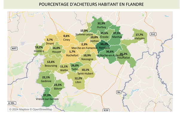 Le phénomène n’est pas neuf ! L’Ardenne intéresse les acheteurs flamands en quête d’une seconde résidence. En 2023, le top 5 des communes les plus populaires aux yeux des Flamands était dans l’ordre : Rendeux (66,2% d’acheteurs venant du nord du pays), Manhay (37,5%), Vresse-sur-Semois (37,3%), La Roche-En-Ardenne (36,6%) et Durbuy (32,4 %). À l’opposé, la proportion d’acheteurs flamands était quasiment anecdotique à Ciney (0,6 %).