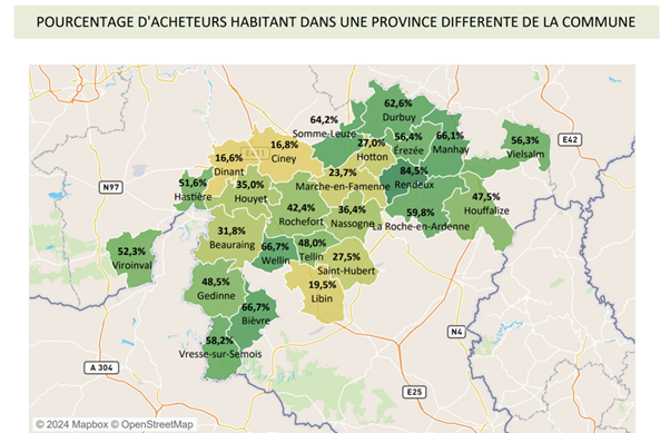 Cet attrait pour certaines communes se confirme quand on prend en compte ceux qui décident d’acheter une maison dans une commune qui n’était pas la leur lors de l’acte de vente. De cette façon, nous constatons que Rendeux (84,5%) attire énormément d’acheteurs venus d’une autre commune. Sur le podium, nous retrouvons ensuite à égalité Bièvre et Wellin (66,7%).