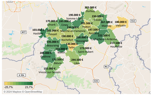 Au niveau des prix médians des maisons, nous constatons une forte disparité des prix médians des maisons. Manhay, avec des maisons à 267.500 est la commune répertoriée la plus chère devant Ciney (245.000€), Libin (244.500€), Wellin (235.000€), Erezée, Nassogne et Marche-en-Famenne (tous trois à 230.000€).